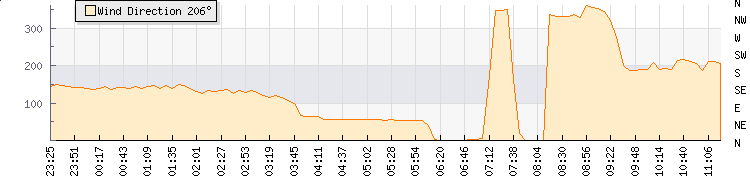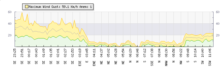 In the last few minutes the wind was Southerly at an average speed of 17 kmh, reaching up to 23 kmh and a low of 12 kmh. The gust strength is11 kmh above the minimum speed |