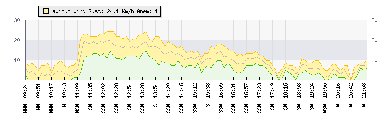 In the last few minutes the wind was South South West at an average speed of 11 kmh, reaching up to 12 kmh and a low of 7 kmh. The gust strength is5 kmh above the minimum speed |