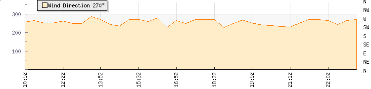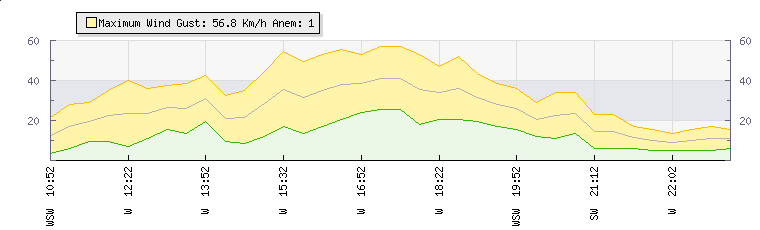 In the last few minutes the wind was South Westerly at an average speed of 14 kmh, reaching up to 23 kmh and a low of 6 kmh. The gust strength is17 kmh above the minimum speed |