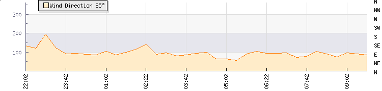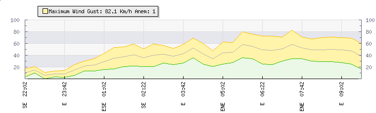In the last few minutes the wind was East South East at an average speed of 49 kmh, reaching up to 68 kmh and a low of 30 kmh. The gust strength is38 kmh above the minimum speed |