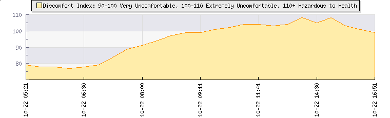 Wind Speed: | 11|21|30 kmh | Wind Direction: | E 89° | Temperature: | 28°C | Wet Bulb: | 17.5°C | Discomfort: | 89 | Humidity: | 33% | Barometer: | 1013.6mb | Dew Point: | 10.2°C | Clouds AGL: | 7116ft (2169 m) | Density-Alt: | 4580ft (1396 m) | Fire Danger: | |