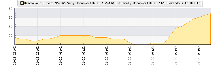| Wind Speed: | 30|49|68 kmh | Wind Direction: | ESE 105° | Temperature: | 23.6°C | | Wet Bulb: | 15.1°C | Discomfort: | 80 | Humidity: | 39% | | Barometer: | 1011.2mb | Dew Point: | 8.8°C | Clouds AGL: | 5910ft (1801 m) | | Density-Alt: | 4157ft (1267 m) | Fire Danger: | |