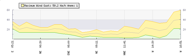 In the last few minutes the wind was Easterly at an average speed of 21 kmh, reaching up to 30 kmh and a low of 11 kmh. The gust strength is19 kmh above the minimum speed |