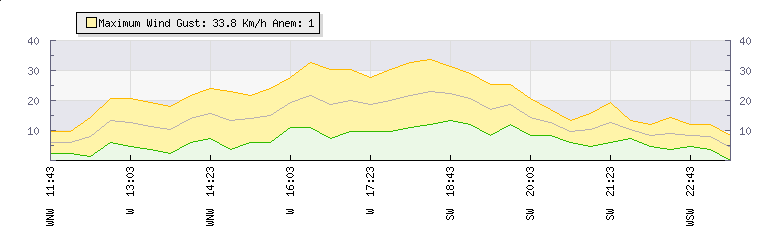 | Wind Gust: | 34 km/h | Min Temp: | 9.9 °C | Max Temp: | 24 °C | | Wind Average: | 23 km/h | Min Hum: | 55 % | Max Hum: | 70 % | |  |