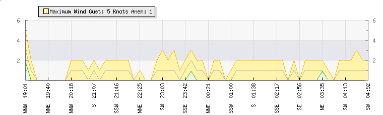 In the last few minutes the wind was West South West at an average speed of 1 knots, reaching up to 3 knots and a low of 0 knots. The gust strength is3 knots above the minimum speed |