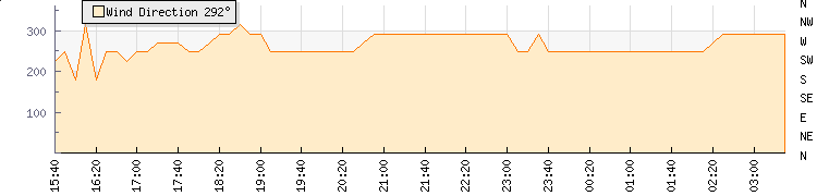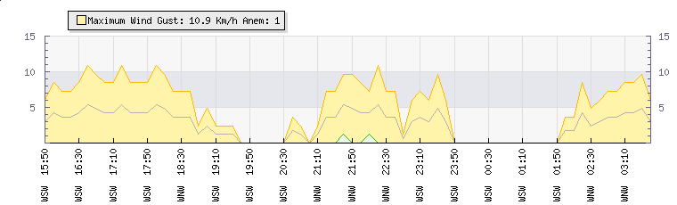 In the last few minutes the wind was West South West at an average speed of 0 kmh, reaching up to 0 kmh and a low of 0 kmh. The gust strength is0 kmh above the minimum speed |