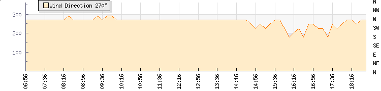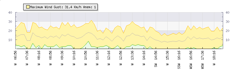 In the last few minutes the wind was West South West at an average speed of 11 kmh, reaching up to 22 kmh and a low of 0 kmh. The gust strength is22 kmh above the minimum speed |