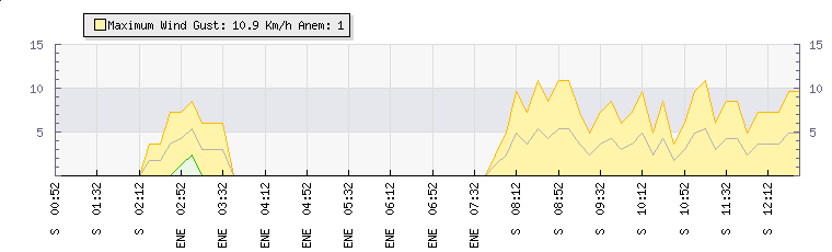 In the last few minutes the wind was Southerly at an average speed of 5 kmh, reaching up to 10 kmh and a low of 0 kmh. The gust strength is10 kmh above the minimum speed |