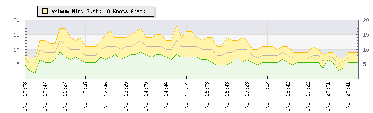Au cours des dernières minutes, le vent étaitOuest Nord Ouest à une vitesse moyenne de 8 knots atteignant jusqu'à 10 knots et un faible de 6 knots. 4 knots au-dessus de la vitesse minimale. |