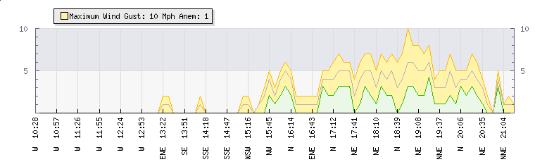 Au cours des dernières minutes, le vent étaitNord Nord Est à une vitesse moyenne de 3 mph atteignant jusqu'à 5 mph et un faible de 1 mph. 4 mph au-dessus de la vitesse minimale. |