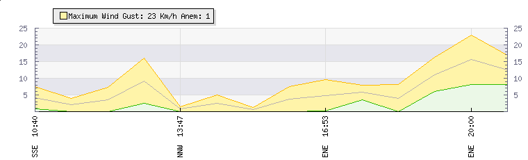 Au cours des dernières minutes, le vent étaitNord Est à une vitesse moyenne de 11 kmh atteignant jusqu'à 16 kmh et un faible de 6 kmh. 10 kmh au-dessus de la vitesse minimale. |