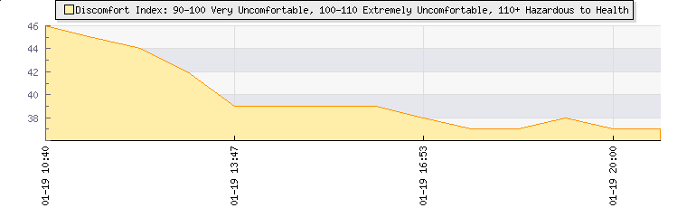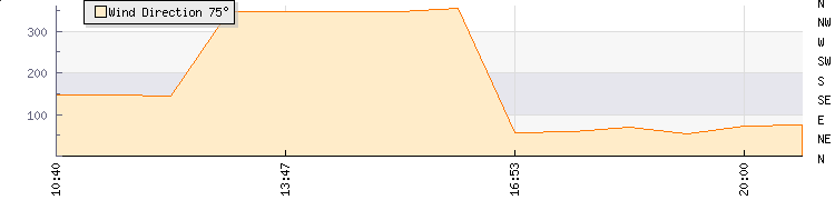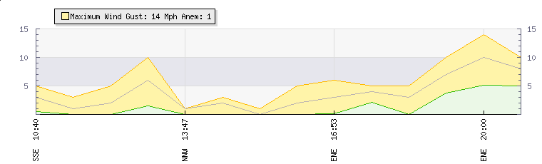 Au cours des dernières minutes, le vent étaitNord Est à une vitesse moyenne de 7 mph atteignant jusqu'à 10 mph et un faible de 4 mph. 6 mph au-dessus de la vitesse minimale. |
