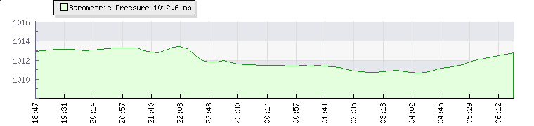 | Wind Speed: | 2|3|4 kmh | Wind Direction: | WSW 238° | Temperature: | 18.8°C | | Wet Bulb: | 18.8°C | Discomfort: | 80 | Humidity: | 100% | | Rainfall Today: | 0mm | 12 hrs Rainfall: | 10.6mm | 24 hrs Rainfall: | 12.9mm | | Barometer: | 1011.2mb | Dew Point: | 18.8°C | Density-Alt: | 1883ft (574 m) | | Fire Danger: | |