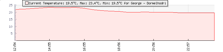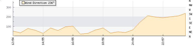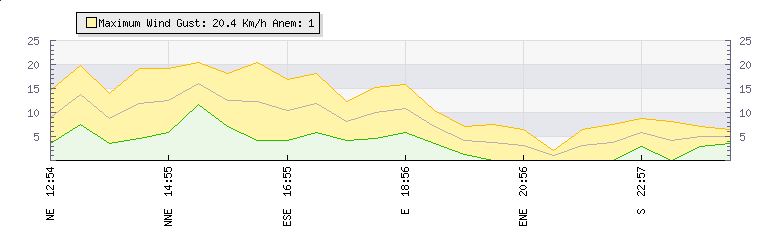 | Wind Gust: | 21 km/h | Min Temp: | 15.9 °C | Max Temp: | 24.3 °C | | Wind Average: | 16 km/h | Min Hum: | 64 % | Max Hum: | 84 % | |  |