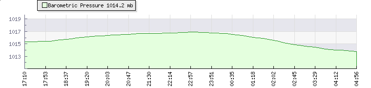 | Wind Speed: | 1|3|6 kmh | Wind Direction: | SW 215° | Temperature: | 17.5°C | | Wet Bulb: | 15.4°C | Discomfort: | 73 | Humidity: | 82% | | Rainfall Today: | 0mm | 12 hrs Rainfall: | 0mm | 24 hrs Rainfall: | 0.3mm | | Barometer: | 1015.2mb | Dew Point: | 14.4°C | Clouds AGL: | 1244ft (379 m) | | Density-Alt: | 1529ft (466 m) | Fire Danger: | |