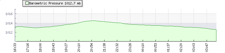 | Wind Speed: | 4|5|6 kmh | Wind Direction: | WSW 240° | Temperature: | 11.7°C | | Wet Bulb: | 7.1°C | Discomfort: | 54 | Humidity: | 56% | | Rainfall Today: | 0mm | 12 hrs Rainfall: | 0mm | 24 hrs Rainfall: | 1.4mm | | Barometer: | 1013.1mb | Dew Point: | 3.2°C | Clouds AGL: | 3394ft (1034 m) | | Density-Alt: | 791ft (241 m) | Fire Danger: | |