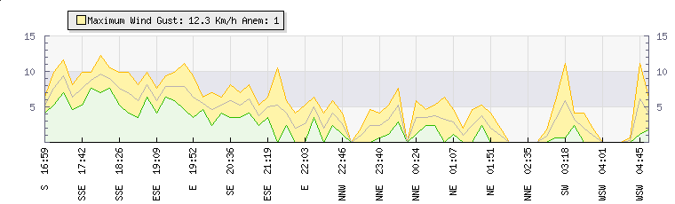 In the last few minutes the wind was South Westerly at an average speed of 3 kmh, reaching up to 6 kmh and a low of 1 kmh. The gust strength is5 kmh above the minimum speed |
