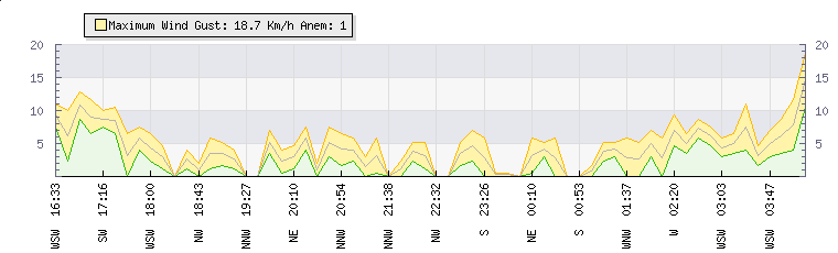 In the last few minutes the wind was West South West at an average speed of 5 kmh, reaching up to 6 kmh and a low of 4 kmh. The gust strength is2 kmh above the minimum speed |