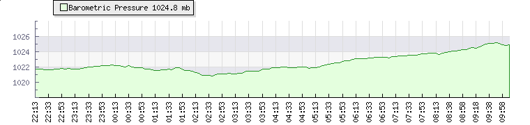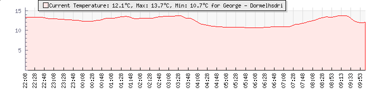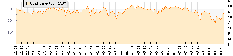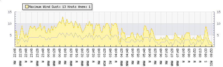 Wind Gust: | 13 knots | Min Temp: | 10.7 °C | Max Temp: | 13.7 °C | Wind Average: | 6 knots | Min Hum: | 100 % | Max Hum: | 100 % | |  |