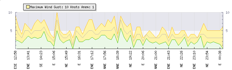 In the last few minutes the wind was North Easterly at an average speed of 3 knots, reaching up to 3 knots and a low of 2 knots. The gust strength is1 knots above the minimum speed |