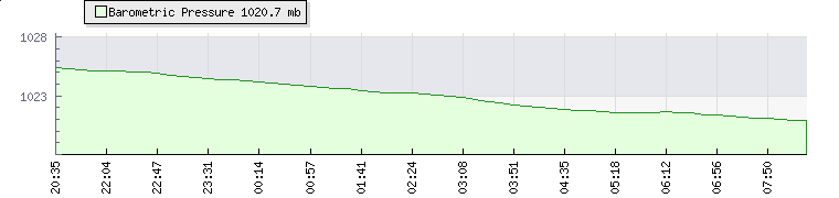 | Wind Speed: | 4|6|8 mph | Wind Direction: | SW 228° | Temperature: | 26.5°C | | Wet Bulb: | 18.6°C | Discomfort: | 89 | Humidity: | 46% | | Rainfall Today: | 0mm | 12 hrs Rainfall: | 0mm | 24 hrs Rainfall: | 0mm | | Barometer: | 1016.9mb | Dew Point: | 13.9°C | Clouds AGL: | 5030ft (1533 m) | | Density-Alt: | 2487ft (758 m) | Fire Danger: | |