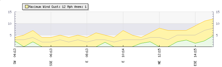 In the last few minutes the wind was South South West at an average speed of 6 mph, reaching up to 9 mph and a low of 3 mph. The gust strength is6 mph above the minimum speed |