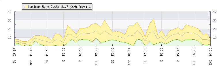 In the last few minutes the wind was South Easterly at an average speed of 6 kmh, reaching up to 11 kmh and a low of 1 kmh.  The gust strength is10 kmh above the minimum speed             |