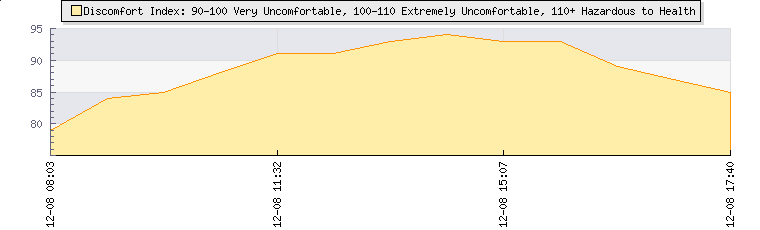 | Wind Speed: | 1|9|17 knots | Wind Direction: | ESE 119° | Temperature: | 27.3°C | | Wet Bulb: | 18.1°C | Discomfort: | 89 | Humidity: | 39% | | Rainfall Today: | 0mm | 12 hrs Rainfall: | 0mm | 24 hrs Rainfall: | 0mm | | Barometer: | 1020.6mb | Dew Point: | 12.2°C | Clouds AGL: | 6076ft (1852 m) | | Density-Alt: | 4882ft (1488 m) | Solar Radiation: | 612Wm² | Fire Danger: | |