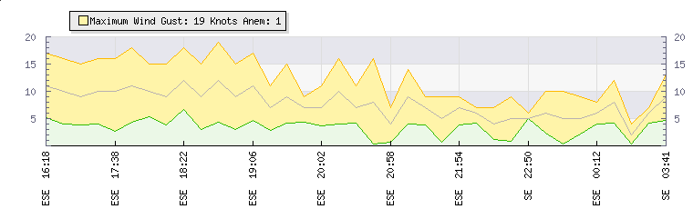 In the last few minutes the wind was South Easterly at an average speed of 6 knots, reaching up to 6 knots and a low of 5 knots. The gust strength is1 knots above the minimum speed |