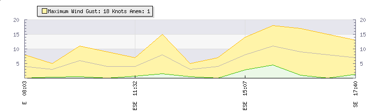 In the last few minutes the wind was East South East at an average speed of 9 knots, reaching up to 17 knots and a low of 1 knots. The gust strength is16 knots above the minimum speed |