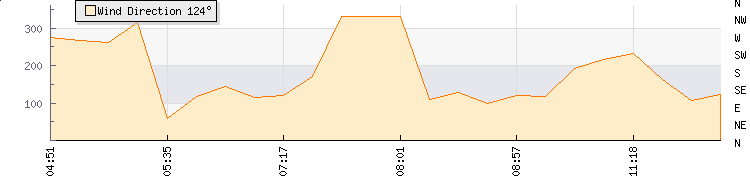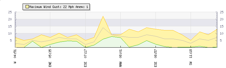 In the last few minutes the wind was East South East at an average speed of 3 mph, reaching up to 5 mph and a low of 0 mph. The gust strength is5 mph above the minimum speed |