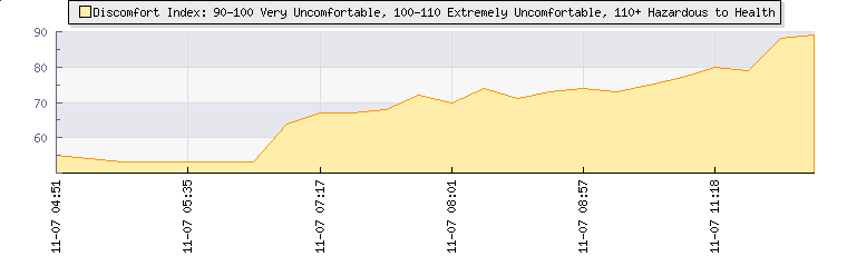 | Wind Speed: | 0|3|5 mph | Wind Direction: | ESE 105° | Temperature: | 14°C | | Wet Bulb: | 10.9°C | Discomfort: | 62 | Humidity: | 72% | | Rainfall Today: | 0mm | 12 hrs Rainfall: | 0mm | 24 hrs Rainfall: | 0mm | | Barometer: | 1004.1mb | Dew Point: | 9°C | Clouds AGL: | 1988ft (606 m) | | Density-Alt: | 3894ft (1187 m) | Fire Danger: | |