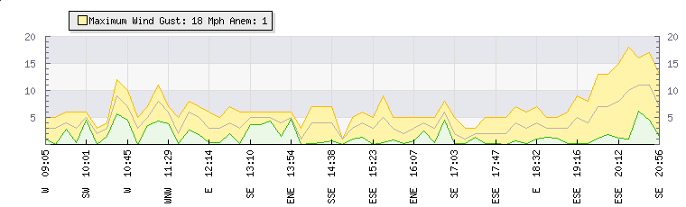 In the last few minutes the wind was East South East at an average speed of 4 mph, reaching up to 8 mph and a low of 0 mph. The gust strength is8 mph above the minimum speed |