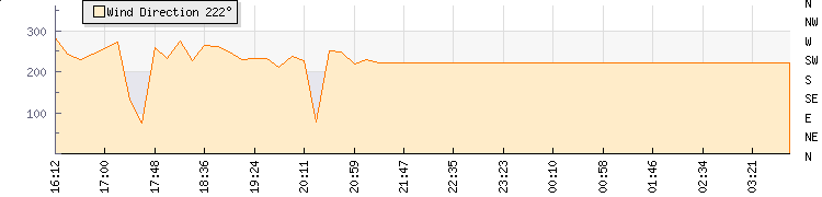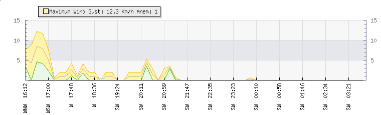 In the last few minutes the wind was South Westerly at an average speed of 0 kmh, reaching up to 0 kmh and a low of 0 kmh. The gust strength is0 kmh above the minimum speed |