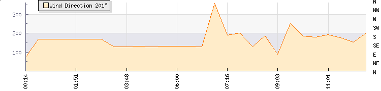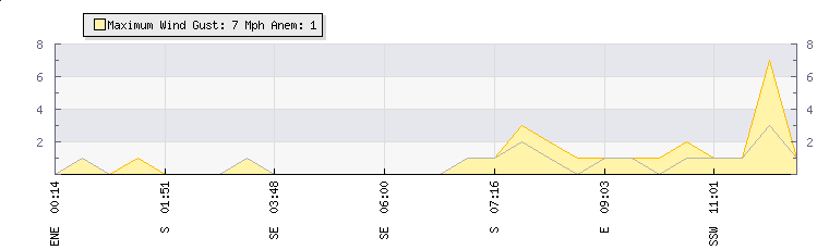 In the last few minutes the wind was Southerly at an average speed of 1 mph, reaching up to 2 mph and a low of 0 mph. The gust strength is2 mph above the minimum speed |