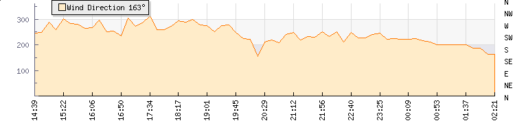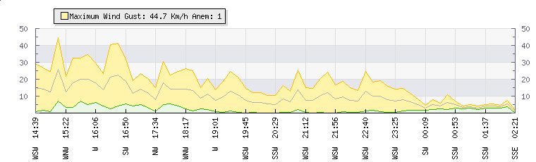 In the last few minutes the wind was South South West at an average speed of 5 kmh, reaching up to 7 kmh and a low of 3 kmh. The gust strength is4 kmh above the minimum speed |