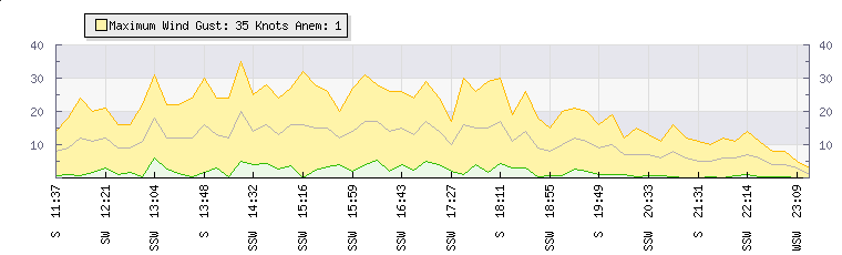 In the last few minutes the wind was South South West at an average speed of 6 knots, reaching up to 11 knots and a low of 1 knots. The gust strength is10 knots above the minimum speed |