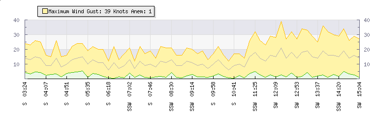 In the last few minutes the wind was South South West at an average speed of 19 knots, reaching up to 33 knots and a low of 4 knots. The gust strength is29 knots above the minimum speed |