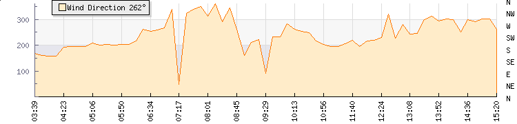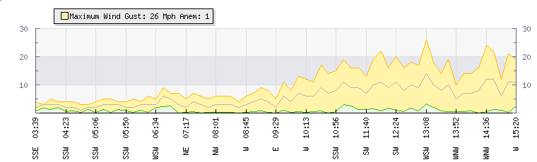 In the last few minutes the wind was West South West at an average speed of 14 mph, reaching up to 26 mph and a low of 3 mph. The gust strength is23 mph above the minimum speed |