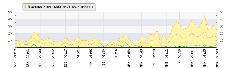 In the last few minutes the wind was North Easterly at an average speed of 9 kmh, reaching up to 17 kmh and a low of 0 kmh. The gust strength is17 kmh above the minimum speed |