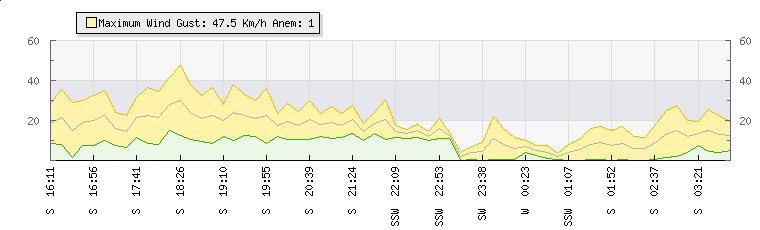 In the last few minutes the wind was South South West at an average speed of 6 kmh, reaching up to 12 kmh and a low of 0 kmh. The gust strength is12 kmh above the minimum speed |