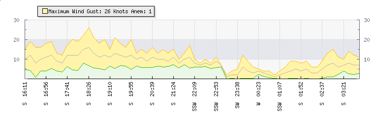 In the last few minutes the wind was South South West at an average speed of 3 knots, reaching up to 6 knots and a low of 0 knots. The gust strength is6 knots above the minimum speed |