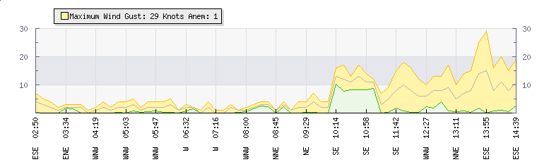 | Wind Gust: | 18 knots | Min Temp: | 14.9 °C | Max Temp: | 23.8 °C | | Wind Average: | 13 knots | Min Hum: | 10 % | Max Hum: | 10 % | |  |