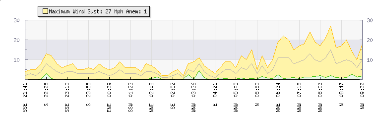In the last few minutes the wind was North Easterly at an average speed of 5 mph, reaching up to 10 mph and a low of 0 mph. The gust strength is10 mph above the minimum speed |