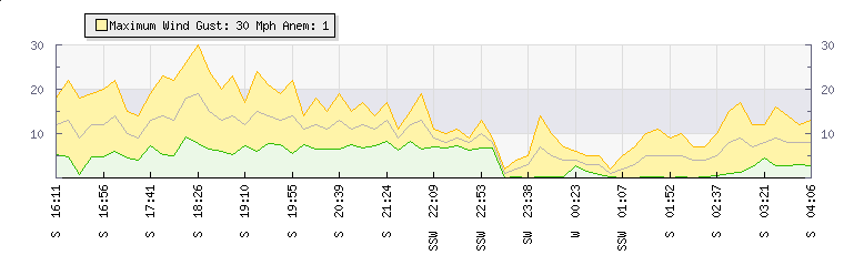In the last few minutes the wind was South South West at an average speed of 4 mph, reaching up to 7 mph and a low of 0 mph. The gust strength is7 mph above the minimum speed |
