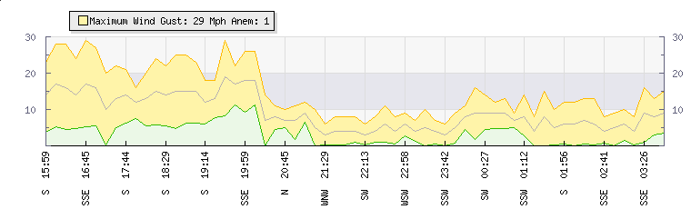 In the last few minutes the wind was Southerly at an average speed of 6 mph, reaching up to 13 mph and a low of 0 mph. The gust strength is13 mph above the minimum speed |