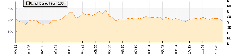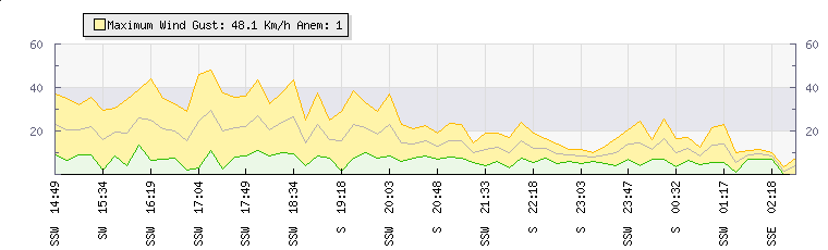 In the last few minutes the wind was South South West at an average speed of 26 kmh, reaching up to 43 kmh and a low of 9 kmh. The gust strength is34 kmh above the minimum speed |