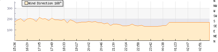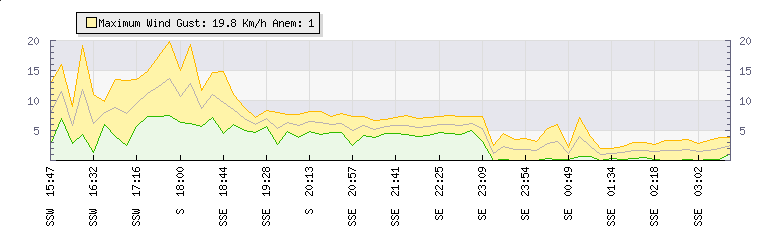 In the last few minutes the wind was South South East at an average speed of 1 kmh, reaching up to 3 kmh and a low of 0 kmh. The gust strength is3 kmh above the minimum speed |