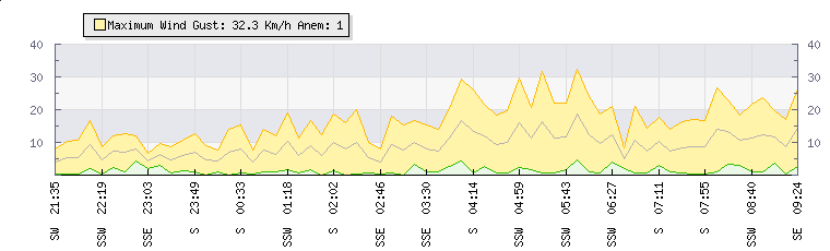 In the last few minutes the wind was Southerly at an average speed of 7 kmh, reaching up to 13 kmh and a low of 1 kmh. The gust strength is12 kmh above the minimum speed |