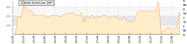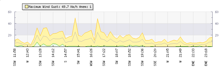 In the last few minutes the wind was South South West at an average speed of 12 kmh, reaching up to 20 kmh and a low of 3 kmh. The gust strength is17 kmh above the minimum speed |